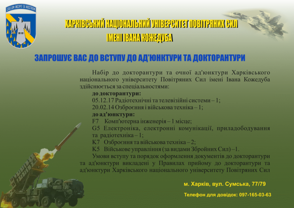 Відповідно до “Порядку підготовки здобувачів вищої освіти ступеня доктора філософії та доктора наук у закладах вищої освіти (наукових установах)”, що затверджений постановою Кабінету Міністрів України від 23.03.2016 №261 (зі змінами) та “Особливостей підготовки здобувачів вищої освіти ступеня доктора філософії та наукового ступеня доктора наук у вищих військових навчальних закладах, військових навчальних підрозділах закладів вищої освіти, наукових установах системи Міністерства оборони України” затверджених наказом Міністерства оборони України від 09.12.2022 №424, навчання в ад’юнктурі Харківського національного університету Повітряних Сил імені Івана Кожедуба та поза ад’юнктурою здійснюється за наступними спеціальностями: