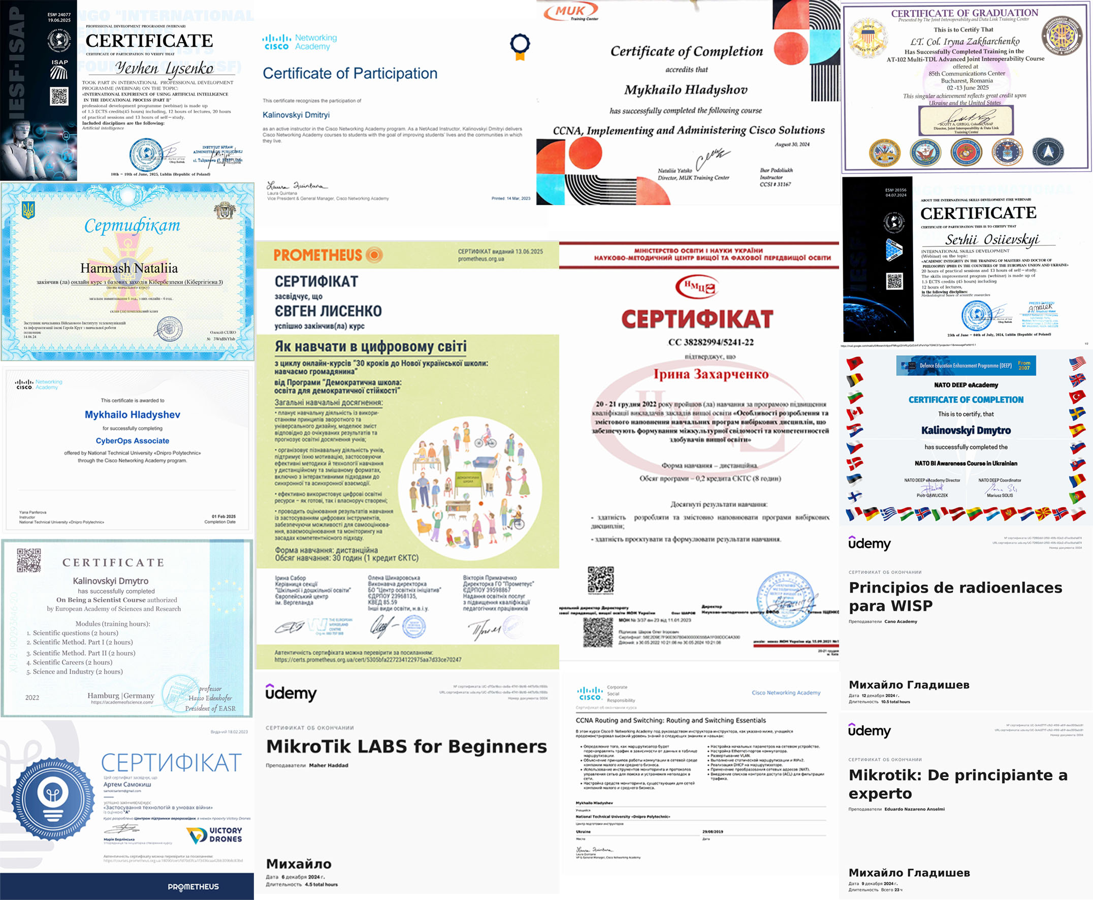 Професіоналізм викладачів підтверджено проходженням спеціалізованого навчання в провідних освітніх закладах та центрах, що забезпечує відповідність підготовки актуальним світовим стандартам.