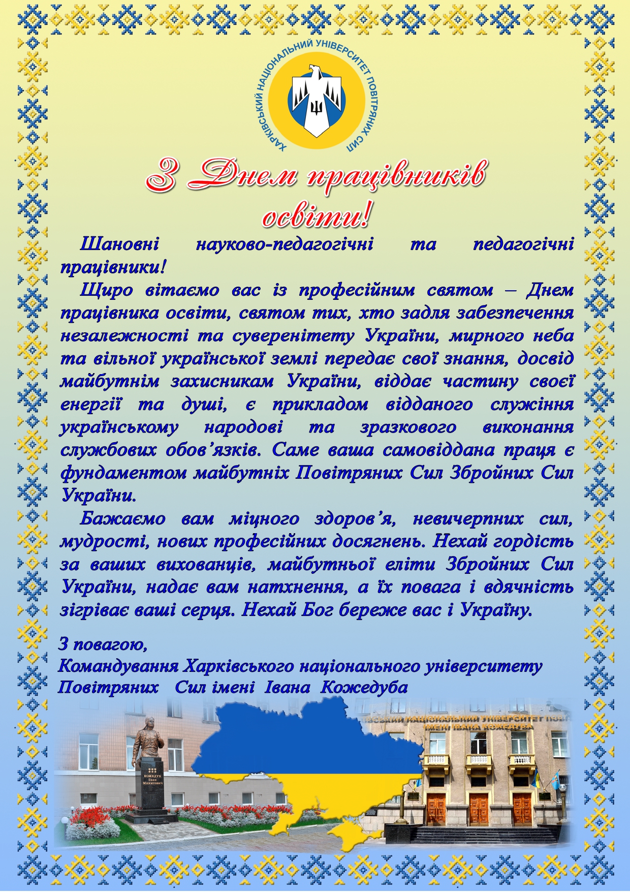 Щиро вітаємо Вас із професійним святом – Днем працівника освіти! Це свято тих, хто, задля забезпечення незалежності та суверенітету України, мирного неба та вільної української землі, передає свої знання й досвід майбутнім захисникам, віддає частину своєї енергії та душі, є прикладом відданого служіння українському народові та зразкового виконання службових обов’язків.