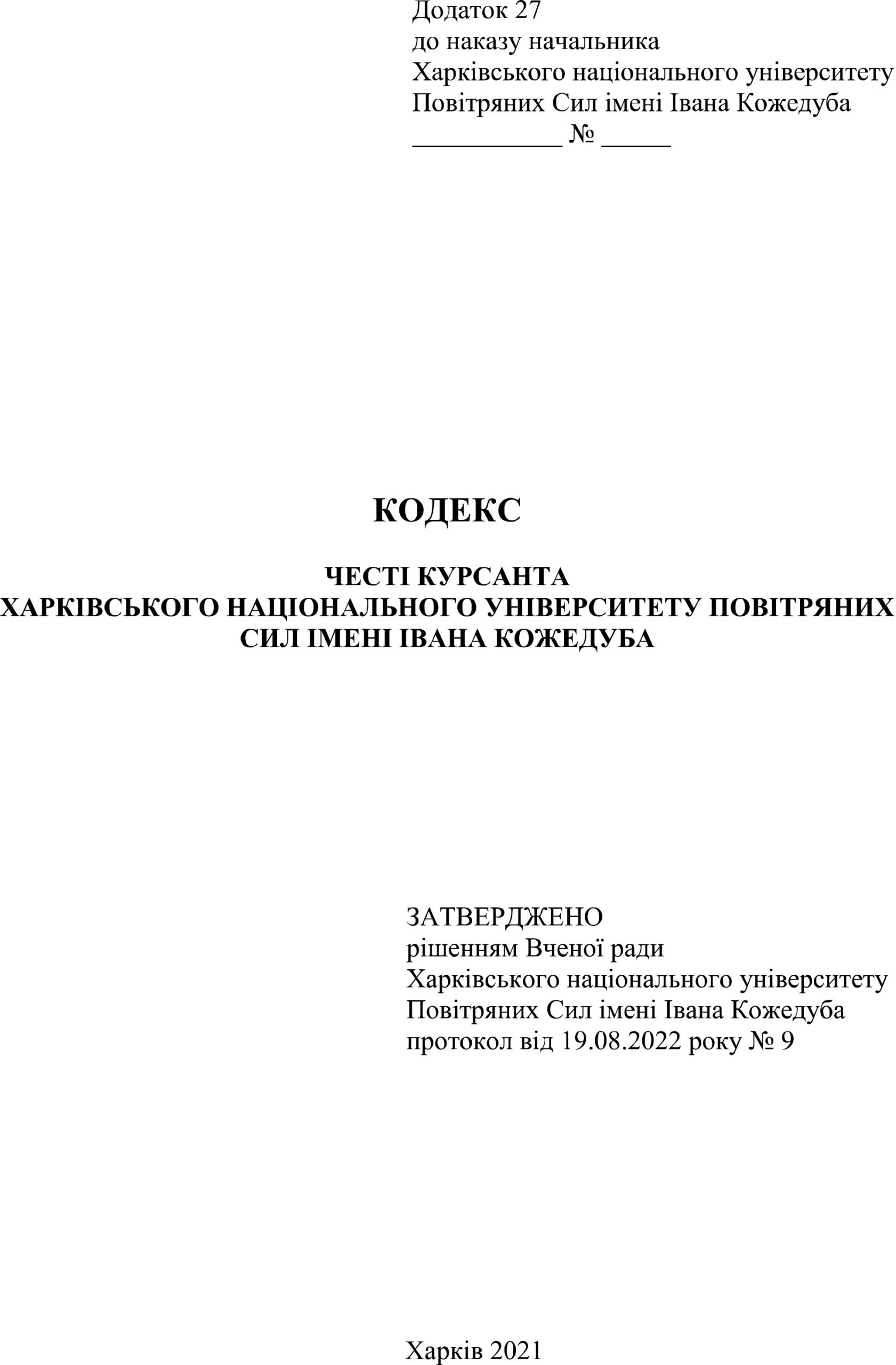 Кодекс честі курсанта Харківського національного університету Повітряних Сил імені Івана Кожедуба – це сукупність морально-етичних норм та ціннісних орієнтацій майбутніх офіцерів, які регламентують його поведінку як захисника та громадянина України. Основу Кодексу честі курсанта Харківського національного університету Повітряних Сил імені Івана Кожедуба становлять вимоги Конституції України, Військової присяги, статутів Збройних Сил України, моральні традиції українського війська та офіцерства попередніх поколінь, базові міжнародні гуманітарні стандарти, морально-етичні аспекти чинного законодавства.