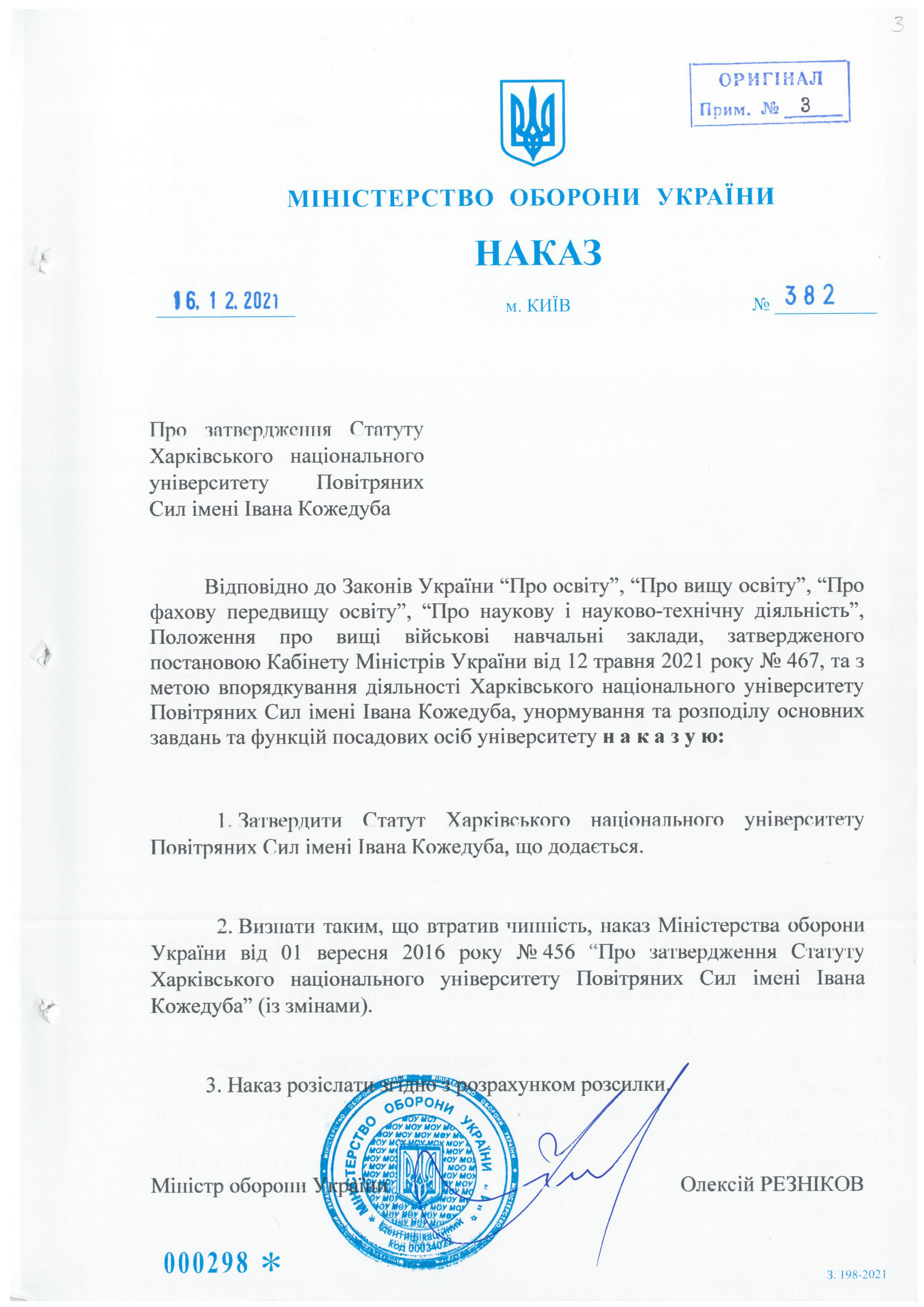 Відповідно до Законів України “Про освіту”, “Про вищу освіту”, “Про фахову передвищу освіту”, “Про наукову і науково-технічну діяльність”, Положення про вищі військові навчальні заклади, затвердженого постановою Кабінету Міністрів України від 12 травня 2021 року № 467, та з метою впорядкування діяльності Харківського національного університету Повітряних Сил імені Івана Кожедуба, унормування та розподілу основних завдань та функцій посадових осіб університету наказую: ……….(читати далі)