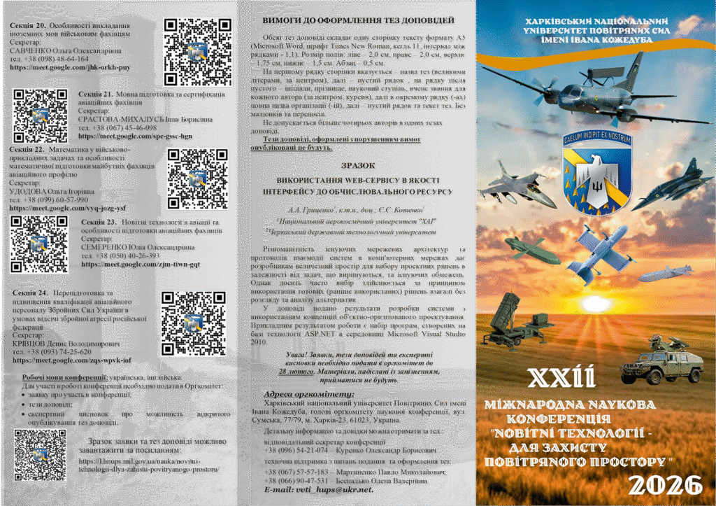 ІНФОРМАЦІЙНЕ ПОВІДОМЛЕННЯХХII міжнародної наукової конференції “Новітні технології – для захисту повітряного простору” Зразок заявки та тез доповіді можливо завантажити за посиланням :/nauka/novitni-tehnologii-dlya-zahistu-povitryanogo-prostoru