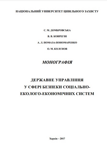 S. Dombrovska, V. Kovregin, A. Pomaza-Ponomarenko "Derzhavne upravlinnia u sferi bezpeky sotsialnoekoloho-ekonomichnykh system" [State management in the field of security of socio-ecological and economic systems]: monografia / S. Dombrovska, V. Kovregin, A. Pomaza-Ponomarenko, O. Kolenov, - Kh .: NUTSZU, 2017. - 244 p