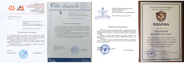 - Канал вимірювання похилої дальності до літальних апаратів з використанням апаратури зв’язку та кіберзахистом інформації для мобільної однопунктної інформаційно-вимірювальної системи. Патент на корисну модель. UA 156568, опубл. 11.07.2024, бюл. №28/2024.